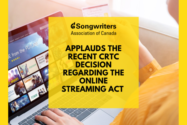 “S.A.C. applauds the recent CRTC decision requiring online streaming companies to contribute to the funding of Canadian, Indigenous and Francophone music and audiovisual content. This will infuse more than $200 million a year into the Canadian cultural ecosystem (with these investments flowing to crucial funds such as FACTOR, Musicaction, the Indigenous music office and more) and is a big win for the arts community in Canada.”